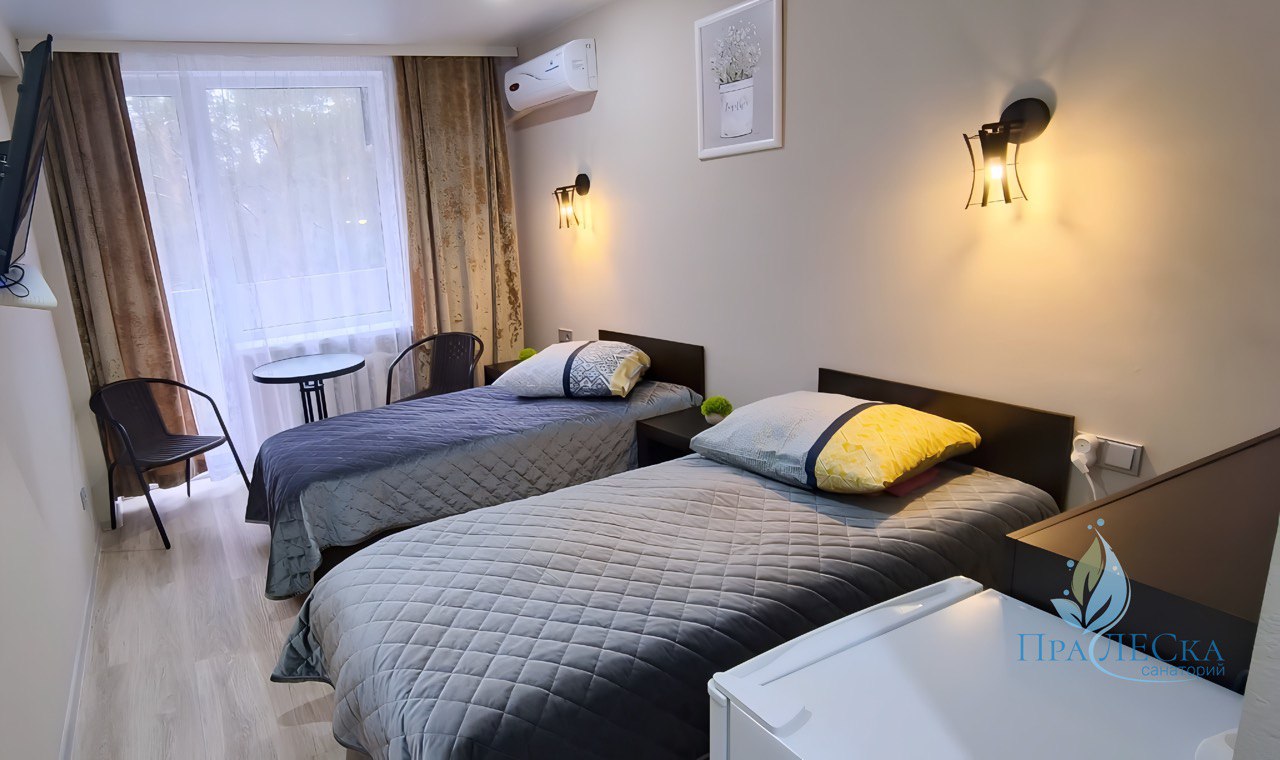 Состоит из одной жилой комнаты. В номере: кондиционер, встроенный шкаф в прихожей, две тумбочки, стул, две односпальные кровати или одна двуспальная, телевизор, холодильник, фен, набор посуды, душ, туалет.