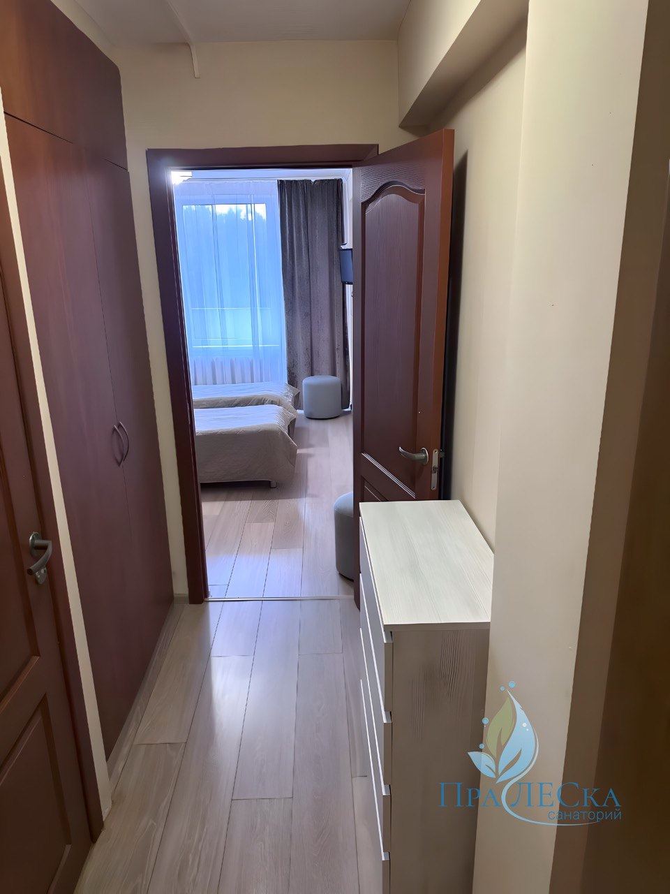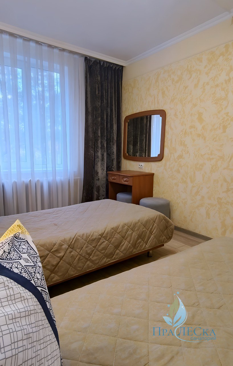 Состоит из одной жилой комнаты. В номере: встроенный шкаф в прихожей, журнальный столик, две тумбочки, два стула, две односпальные кровати или одна двуспальная, телевизор, холодильник, фен, набор посуды, душ, туалет.